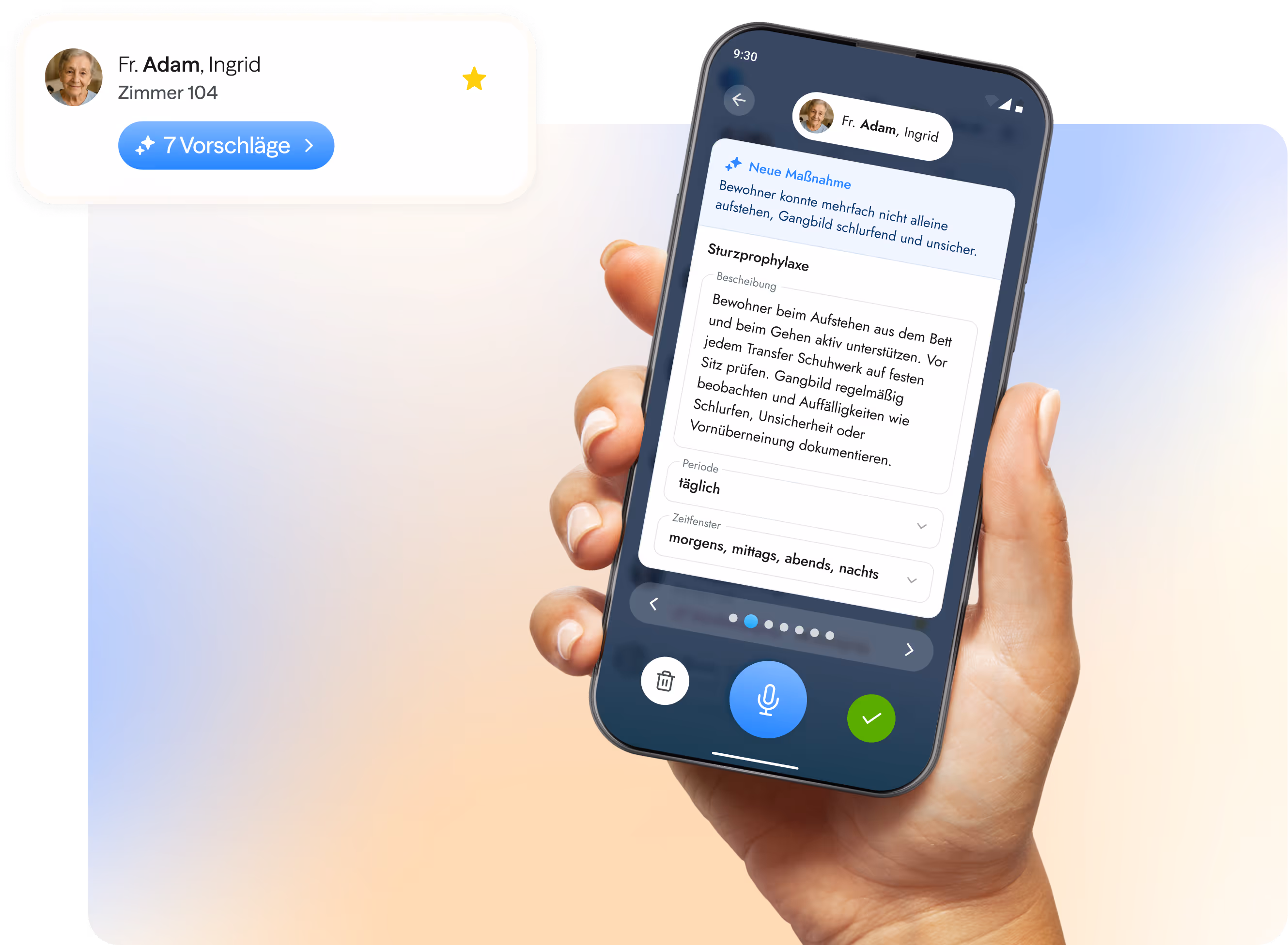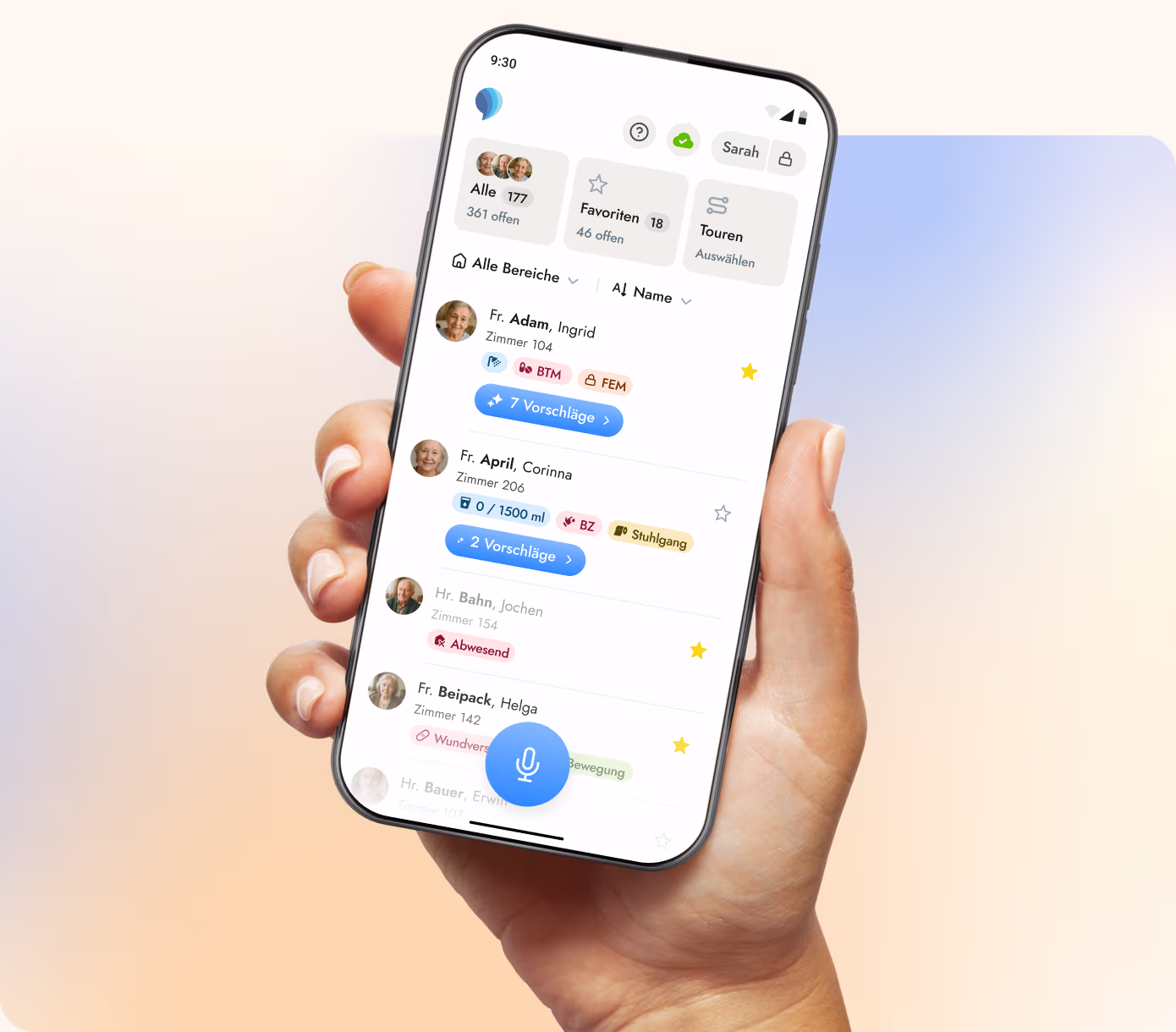 Pflegekräfte sprechen Beobachtungen, Auffälligkeiten und Veränderungen direkt in die App – nah am Moment, ohne Umweg über den PC.